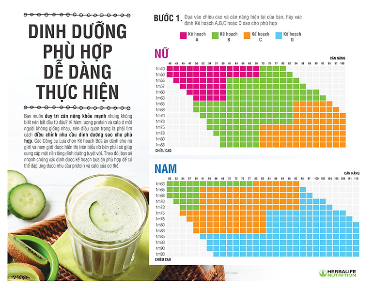 Bạn đang tìm kiếm một kế hoạch bữa ăn đơn giản, dễ dàng và hiệu quả? Các bác sĩ và chuyên gia dinh dưỡng Herbalife sẽ giúp bạn dễ dàng thực hiện được điều này. Hãy cùng xem những hướng dẫn bao gồm công thức nấu ăn và hướng dẫn xây dựng bữa ăn bên dưới nhé! Bước 1: Công Cụ Lựa Chọn Kế Hoạch Bữa Ăn Công Cụ Lựa Chọn Kế Hoạch Bữa Ăn sẽ hướng dẫn bạn cách lựa chọn các bữa ăn được đề xuất dựa trên giới tính, cân nặng và chiều cao của bạn. Mỗi bữa ăn có bốn lựa chọn (A, B, C và D). |